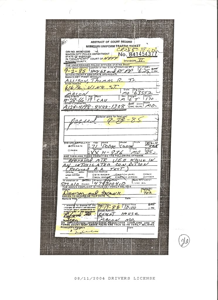 Missouri record showing alleged 1985 DWI